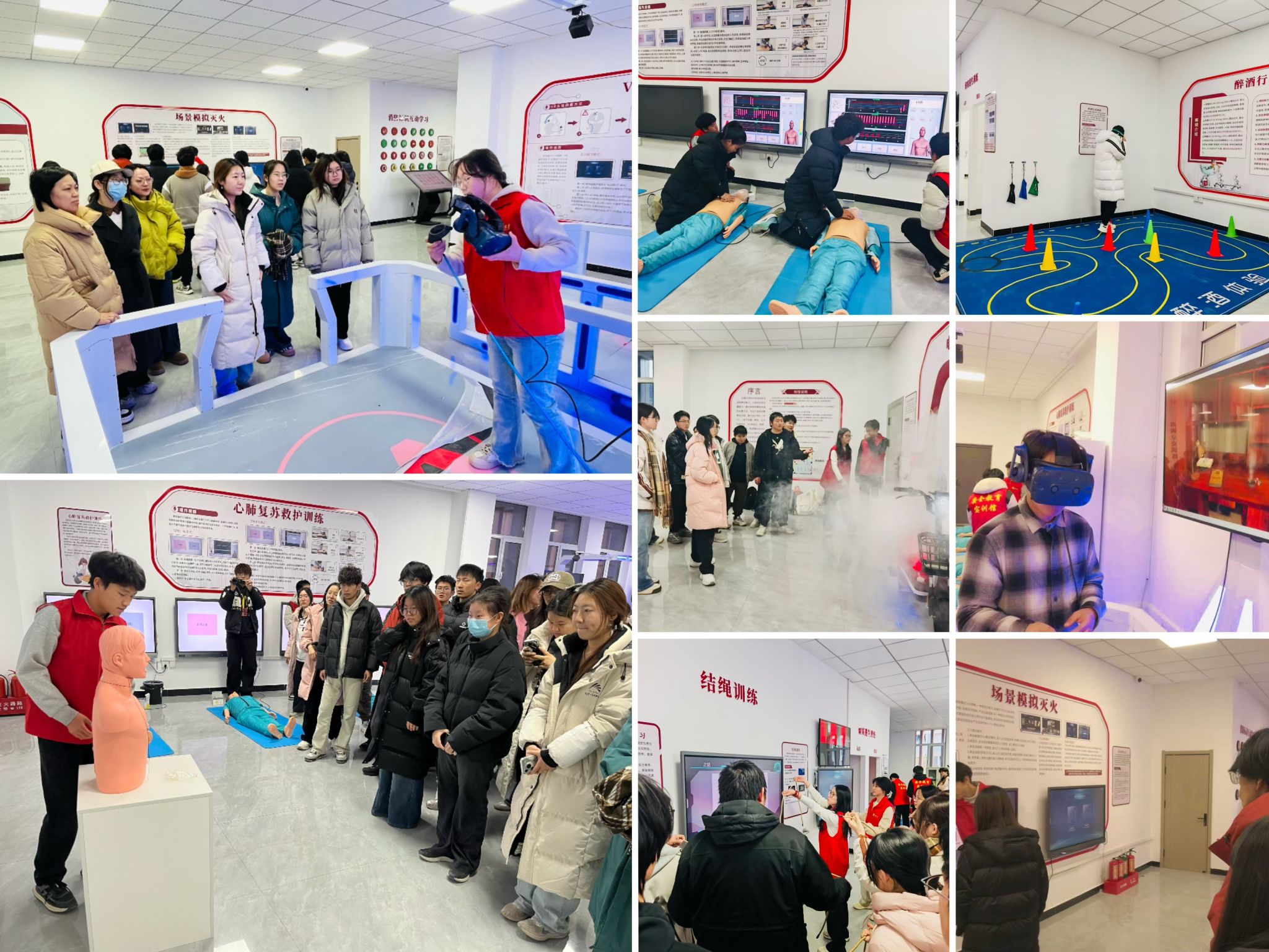 实训过程中,杜晓强详细介绍了安全教育实训馆的功能分区和各实训模块的具体情况。同学们在实训馆志愿者的指导下依次参与了消防安全、应急救护与沉浸式体验三大核心板块的技能实训。在消防安全时间板块,同学们通过电动车充电过载火灾模拟,直观认识违规充电的巨大风险,在实际操作过程中,学习了不同灭火器的使用方法,以趣味问答和触摸感应的方式,熟悉了各类消防标识的含义和逃生结绳方法,在模拟烟雾中亲身体验和学习了火灾逃生过程的关键要点。在应急救护板块,同学们利用专业设备反复练习海姆立克急救法、心肺复苏(CPR)的标准化操作流程。在沉浸式体验板块,同学们通过VR等模拟体验设备沉浸式感受了醉酒状态下身体与认知的偏差,体验了各类应急逃生场景。