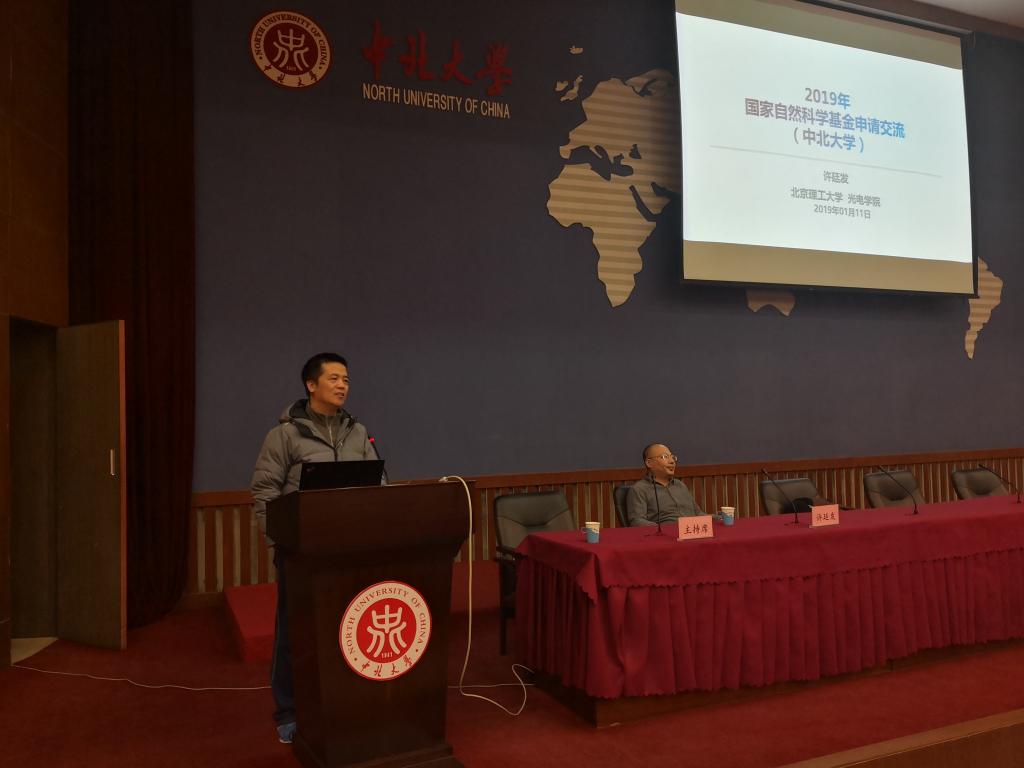在图书馆五层学术报告厅召开了2019年度国家自然科学基金申请经验交流报告会。学院邀请了北京理工大学许廷发教授与各位教师进行了现场交流,副院长王黎明教授主持并全程参与了此次报告会。