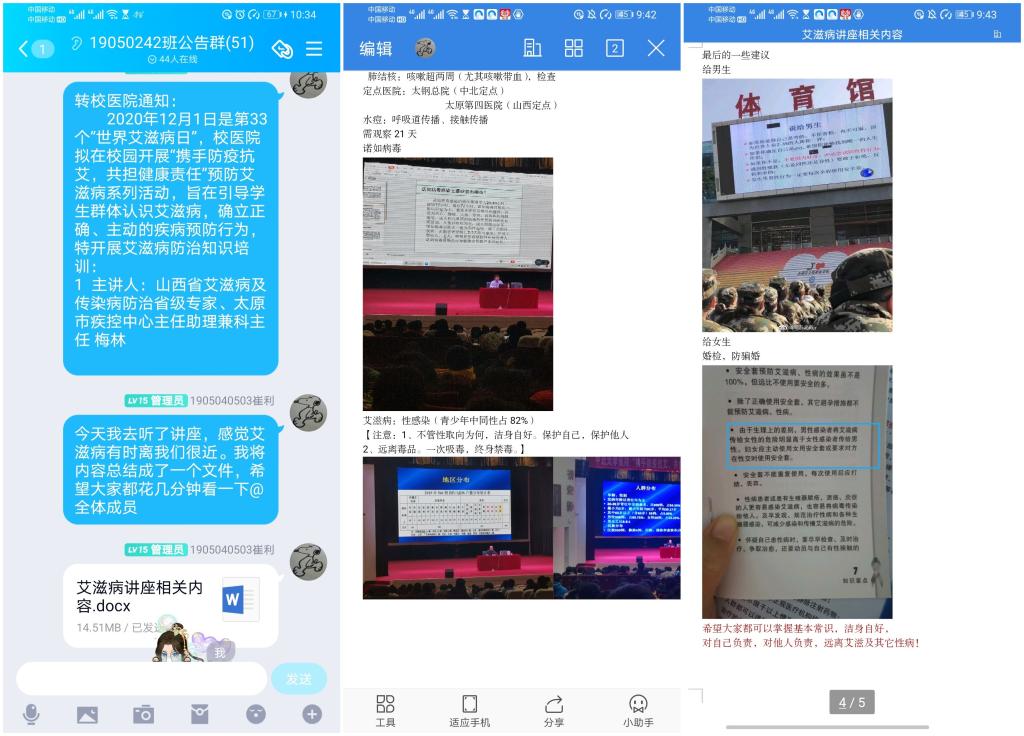 学院下发召开“携手防疫抗艾,共担健康责任”的主题班会后,各班级积极响应,通过QQ群、班会等形式,举办PPT防艾知识普及、观看防艾视频、组织防艾知识有奖竞答等活动,让每一位同学都能正确认识艾滋病的传播途径,了解艾滋病的相关基础知识,最关键的是知道如何预防艾滋病。有的班级还带上红丝带,让同学们学会尊重艾滋病患者,用心用爱用行动去关心这个特殊的群体。班会后,有的班级同学还写了防艾知识心得感想,希望自己也成为防艾宣传志愿者。