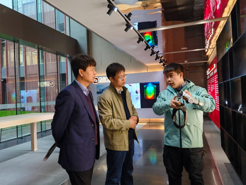 2009届校友副董事长胡金鑫和知识产权部部长刘晖陪同参观影创科技实验室,并指导母校一行体验各类虚拟现实应用场景。