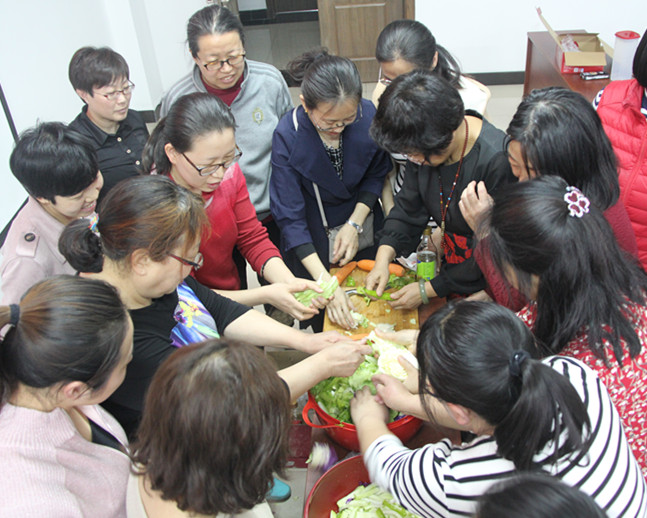 邀请特百惠三墙路门店店长智心大姐,带来紫甘蓝、胡萝卜、芹菜等新鲜食材,亲手制作泡菜、果蜜等时令食品。老师们纷纷参与其中,有的切菜,有的装盘,忙得不亦乐乎,房间里充满了欢声笑语。