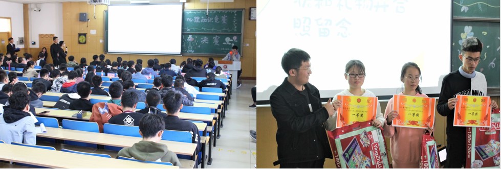 活动开始,首先由主持人进行简短的开场,介绍每位嘉宾,参赛的四组队伍进行自我介绍。比赛分为三个环节:必答题、抢答题、翻盘题,每个环节结束后都有一个串场小游戏,调动了会场的气氛。题目由简到难,由常识到专业知识,四组选手认真思考、激烈抢答,显现出了丰富的心理知识和敏捷的应对能力。比赛结束,由嘉宾为选手们颁发了奖状,送上了精美的礼品!