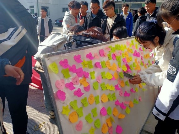 11月18日至20日中午,冬日的暖阳洒落在大地,为这寒冷的时节镀上了一层暖意,在文韬四宿舍楼前的大柳树下,“生命教育周”活动顺利进行,“你无法延长生命的长度,却可以把握它的宽度;无法预知生命的外延,却可以丰富它的内涵;无法把握生命的量,却可以提升它的质。”在活动中,有的同学们拿起一张张便利贴,写下自己近期的小目标,对朋友的祝福,无处倾诉的烦心事或是对未来的期许,还有的同学们分享了令自己感动的照片,小小的留言板上承载了同学们满满的真情,一张张充满温情的便利贴,一张张美好的照片汇聚在一起,成为了大柳树下一道靓丽的风景线,吸引了很多同学们驻足观看。