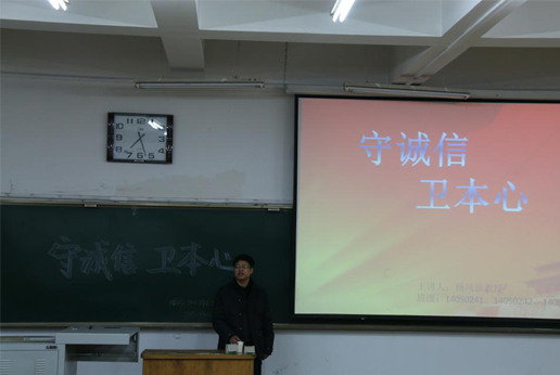 为加强学生对诚信、诚心的深入学习,提高自身的道德修养。2015年11月26日晚上,学院14级通信专业在10104教室开展了“守诚信、卫本心”的道德修养主题班会。