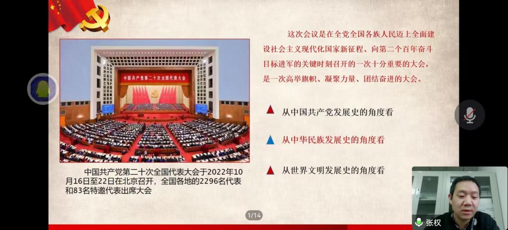 张权老师从党的二十大的主题和主要成果、过去5年的工作和新时代10年的伟大变革、不断开辟马克思主义中国化时代化新境界、中国式现代化、全面建设社会主义现代化国家的目标任务、坚持党的全面领导和全面从严治党的重大部署、应对风险挑战的战略安排等7个方面,对党的二十大精神进行了全面深入的阐述和解读。
