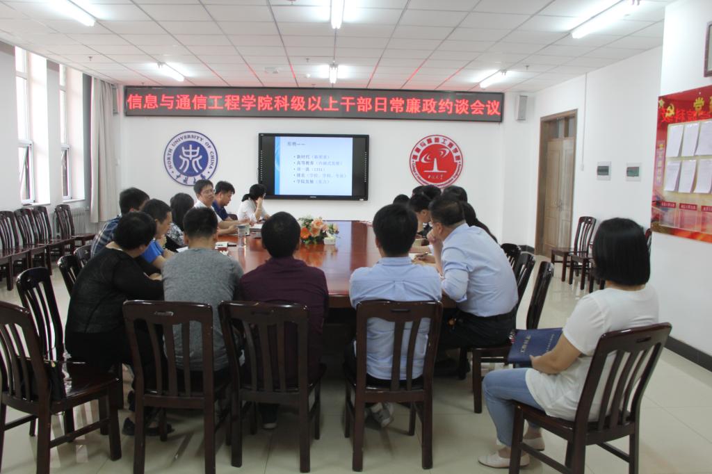 党委在科学楼713会议室进行了科级以上干部廉政约谈工作。全体院领导、党委委员、学科管理部主任和副主任、各科室负责人参加了本次会议。