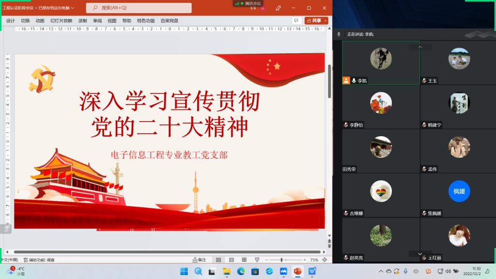2022年12月2日,根据院党委的安排部署,电子信息工程专业教工党支部利用腾讯会议平台召开“党的二十大精神”学习会,党支部书记李凯作了专题党课。