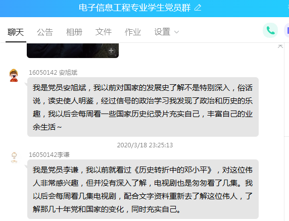 3月18日,电子信息工程学生党支部在院党委的号召下,全体党员在网上一起学习了《总书记回信点赞90后党员,青年反响热烈》、《习近平总书记的回信在北京大学援鄂医疗队全体“90后”党员中引起强烈反响》两篇文章。