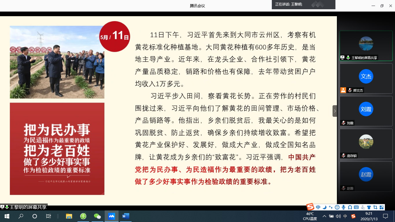 为进一步提高党员思想政治素质,深刻领会习近平总书记视察山西重要讲话重要指示精神,结合当前疫情防控情况,根据院党委安排,2020年7月13日上午9点,学院党委委员王黎明教授为电工电子教工党支部全体党员领学了习近平总书记视察山西重要讲话重要指示。会议由支部书记郎文杰主持,会议形式采用腾讯会议线上集中学习的方式。