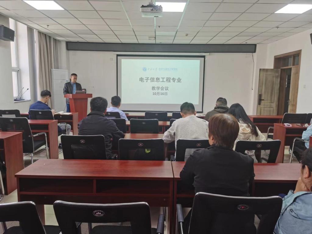 最后,陈平院长对本次电子信息工程专业的教学会议做了评价。他强调,电子信息工程专业是国家级一流专业建设点、教育部第二批特色专业建设点,是学院的品牌优势专业,各一线教师要发挥主观能动性,积极落实学政策。通过组织新入职教师参与项,促进新入职教师提高专业技术水平和指导学生实践的能力,形成教师队伍自主培育的完整链条。